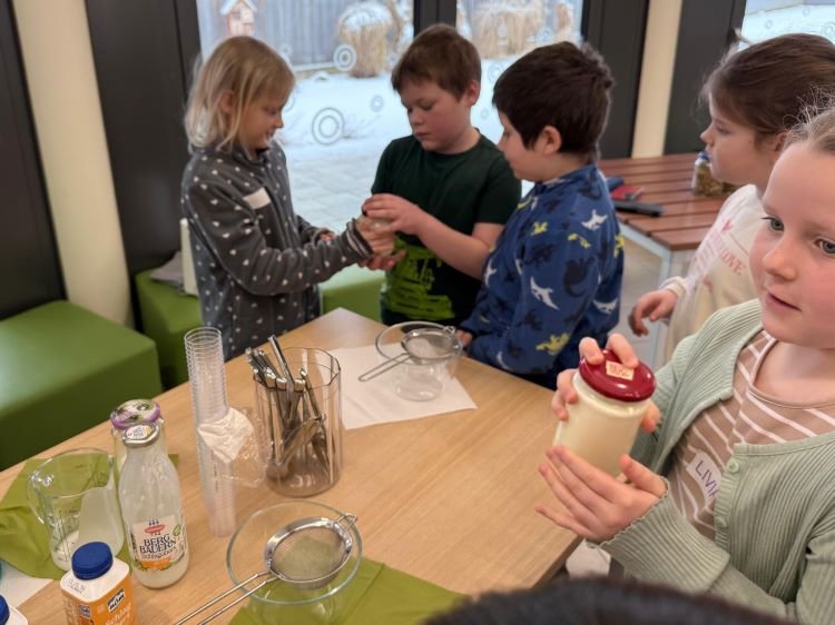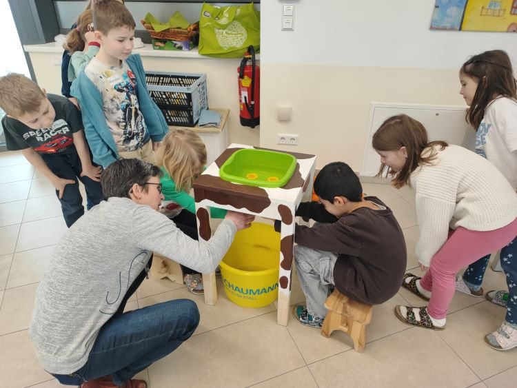 Am 16. Februar waren die Bäuerinnen auf Besuch. Manuela Deimel, Sabine Hündler und Ulrike Strobl erzählten den Kindern der 1. und 2. Schulstufe Wissenswertes über die Milchwirtschaft. Die Schülerinnen und Schüler lernten verschiedene Futtersorten kennen und durften das Melken ausprobieren. Mit Schlagobers stellten sie selbst Butter her und kosteten gleich die Buttermilch. Jausenbrote mit der selbstgemachten Butter durften dabei natürlich nicht fehlen!